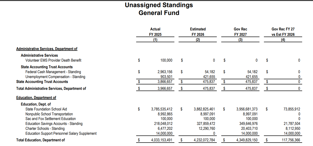 • More detail will be shared next week when the LSA Staff releases their specific Analysis of FY 2027 Governor’s Recommendations for Unassigned Standings Appropriations and Education Appropriations.