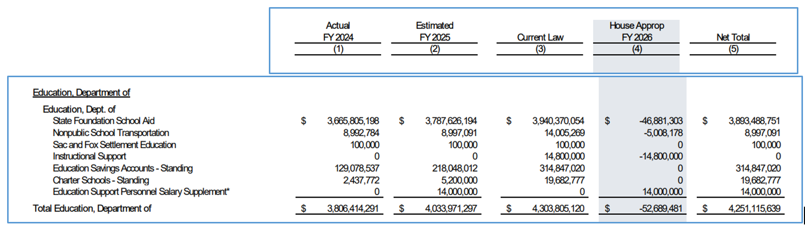 - Cuts AEAs $25 million in addition to the $7.5 million statutory reduction. Although this is the same amount of reduction as FY 2025, the process will be different. Since AEA funding now goes to school districts first, we expect this reduction to impact school district special education funds. It is unknown if the DOM will have the authority to reduce or prorate any of the reduction to media or educational services.