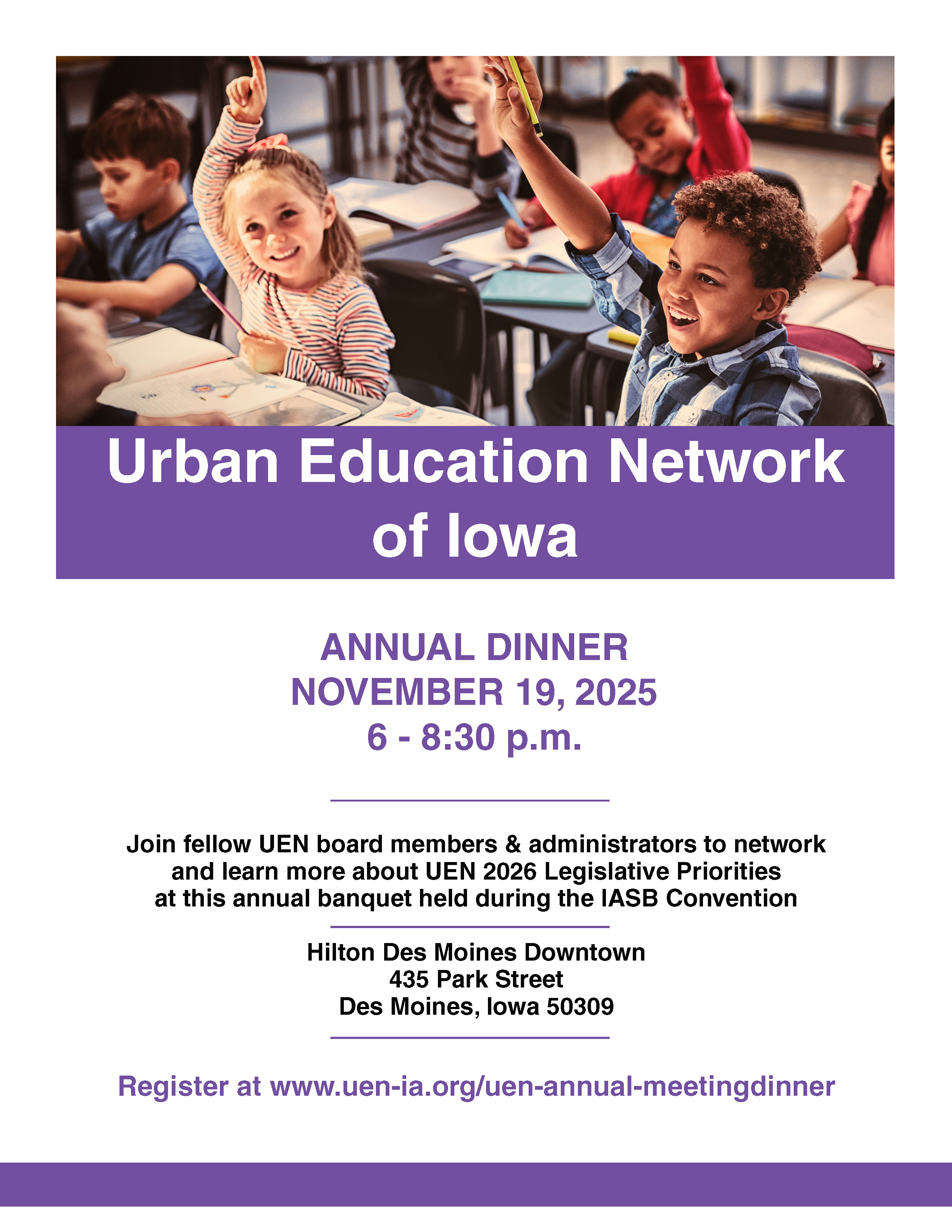 The 2025 UEN Annual Dinner will take place on Wednesday, November 19, 2025, beginning at 6 pm, at the Hilton Des Moines Downtown, 435 Park Street, Des Moines, Iowa, 50309 (during the IASB Convention). UEN member district board members and administrators are encouraged to attend for networking and to learn more about the UEN 2026 Legislative Priorities at this annual banquet. For questions, contact Jen Albers.